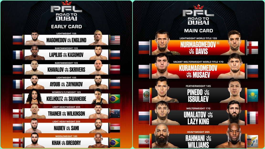 الرؤية المصرية:- تعود دبي لاستضافة النسخة الثالثة من بطولة "الطريق إلى دبي" لرابطة المقاتلين المحترفين (PFL) يوم 7 فبراير 2026 في صالة كوكاكولا أرينا، مع مشاركة ثمانية مقاتلين تحت إشراف الأسطورة حبيب نورمحمدوف.